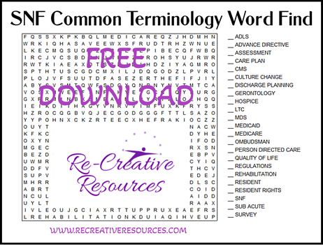 This word find has 23 common words used in Skilled Nursing Facilities (SNF). This may be used as part of employee training, inservices, facility contests, family and resident education, and more. Just download and print!