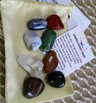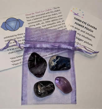 This Basic Chakra Power Pouch is designed to help you balance the following chakras (Earth Star, Root, Sacral, Solar Plexus, Heart, Throat, Third-Eye, and Crown). Includes the following stones: Black Obsidian, Red Jasper, Shiva Lingam, Tiger Eye, Ruby Fuchsite, Blue Calcite, Iolite, and Clear Quartz point. You also receive a velour bag, affirmation card, and printed directions.