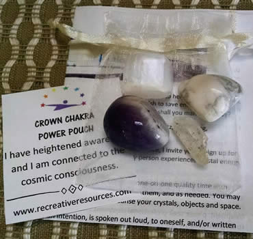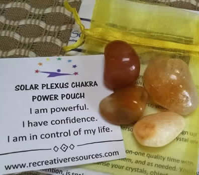 This pouch is designed with the intent to help balance the Solar Plexus. Includes one of each: Citrine (baked Amethyst), Yellow Calcite, Yellow Jasper, Golden Quartz, organza bag, affirmation card, and printed directions. Price: $10.25 + shipping