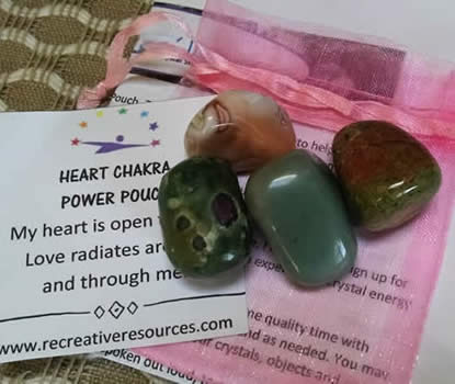 This pouch is designed with the intent to help balance the Heart Chakra. Includes one of each: Green Aventurine, Unakite, Pink Botswana Agate, Ruby Fuschite, organza bag, affirmation card, and printed directions.