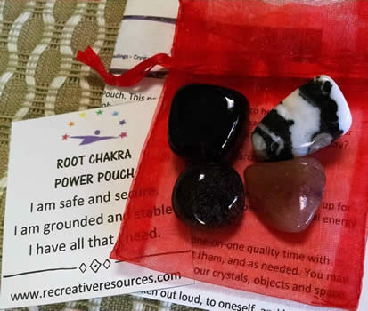 This pouch is designed with the intent to help balance the Root Chakra. Includes one of each: Red Tiger Eye, Black Agate (dyed) , Red Aventurine, Zebra Jasper, organza bag, affirmation card, and printed directions.