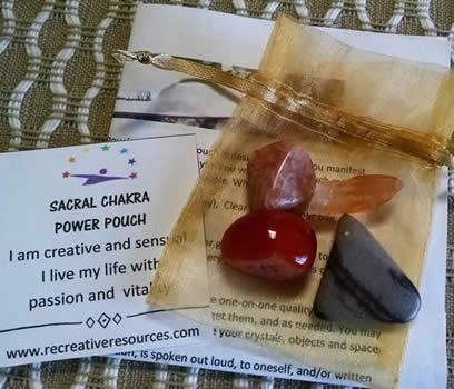 This pouch is designed with the intent to help balance the Sacral Chakra. Includes one of each: Carnelian (may be treated), Sunstone, Shiva Lingam, Tangerine Quartz point, organza bag, affirmation card, and printed directions. Price: $11 + shipping