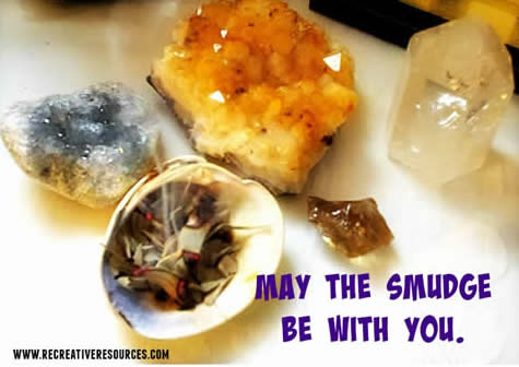 Simply stated, smudging is a ceremonial method of burning various herbs and resins to clear away unwanted energies. Many use sage, sweetgrass, lavender, palo santo wood, frankincense, myrrh, copal, or cedar (to name a few). Intention is very important and it is recommended that you open a window to let the "negative" go OUT. You can direct the negative or unwanted energies to go out the window or with your mind’s eye, create a black hole and direct the “negative” energy to go there.