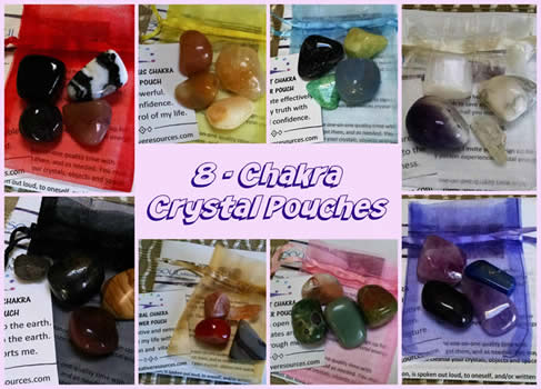 Chakras are energy centers located in the body and are said to affect our mind, body and spirit. A variety of crystal chakra power pouches are available for the following chakras: Earth Star, Root, sacral Solar Plexus, Heart, Throat, 3rd Eye and Crown. Individual pouches are available as well as a set of all 8. Please visit the Chakra Products page to view and adopt.