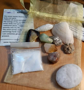 These Beach Power Pouches are designed to help you connect with the energy of the beach and ocean. Includes: Citrine (heat-treated Amethyst), Sunstone, Seashells, Aquamarine, Septarian Nodule, beach rock, Moonstone, Sea Urchin fossil, sea salt, large organza bag, affirmation card, and printed directions.