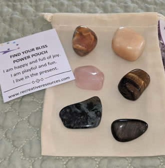 Feeling a little blue or unmotivated? These are some of my favorite happy stones. This crystal power pouch is designed to put a little pep in your energetic step and play in your day. Includes one of each: Crazy Lace Agate, Gold Sheen Obsidian, Orange/Yellow Calcite, Gold Tiger Eye, Ocean Jasper, and Rose Quartz. velour bag, affirmation card, and printed directions.