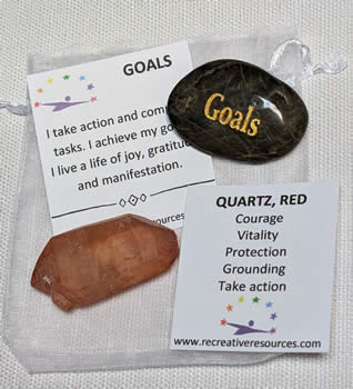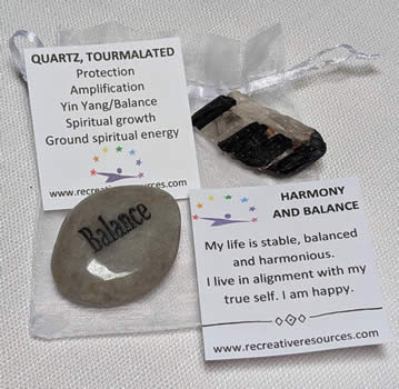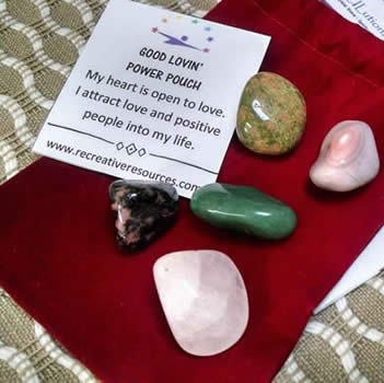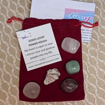 Includes one of each: Pink Calcite, Rose Quartz, Green Aventurine, Pink Tourmaline in Quartz, Red Aventurine, velour bag, affirmation card, and printed directions.
