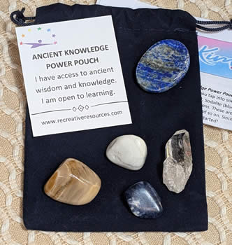 It is said that the ancients knew a lot about the way in which the universe works. This power pouch is designed to help you tap into some of this ancient wisdom, the Akashic Records and your past/alternative lives. Includes one of each: Lapis Lazuli thumb stone, Clear Quartz point, White Howlite, Sodalite, Petrified Wood, velour bag, affirmation card, and printed directions.