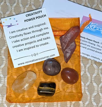 The energies of this power pouch are combined to help inspire and motivate you to get those creative juices flowing. This pouch is perfect for any type of creative project, hobby, work and so on. In addition, the crystals in this pouch are associated with the root, sacral and solar plexus chakras. Includes one of each: Red Aventurine, Orange Calcite, Red Quartz point, Tiger Eye, Carnelian, organza bag, affirmation card, and printed directions.