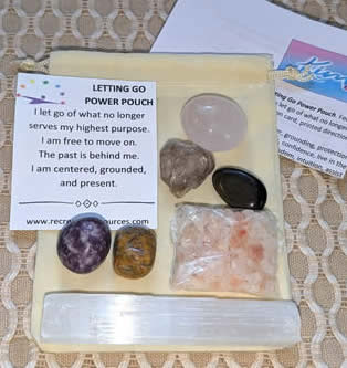 Feeling stuck in the muck or as if something is weighing you down? The energies of this power pouch are combined to help you let go of what no longer serves you so that you can forge forward. This power pouch includes one of each: Gold Sheen Black Obsidian, Crazy Lace Agate, Lepidolite, Satin Spar Selenite stick, Rose Quartz, Smokey Quartz elestial (rough), Himalayan Salt chips, velour bag, affirmation card, and printed directions. Also includes a bonus Letting Go PDF that will be sent via email.