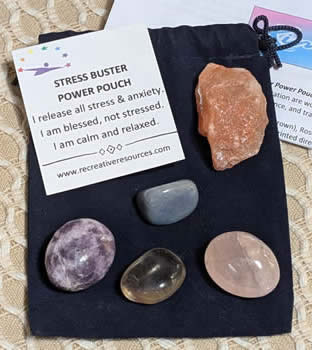 We all have stress in our lives from time to time. This power pouch is designed to help you with stress relief, love, joy, peace, balance, and transmuting negative energies. Be blessed, not stressed! Includes one of each: Smokey Quartz (may have been artificially irradiated), Rose Quartz, Lepidolite, Blue Quartz, Halite rough, velour bag, affirmation card, and printed directions.