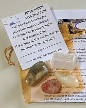 This power pouch is designed to help you connect with the glorious energies of the sun and the moon. Includes one of each: Large Moonstone, large Satin Spar Selenite hand polished, Citrine (heated Amethyst), small Sunstone, organza bag, affirmation card, and printed directions.