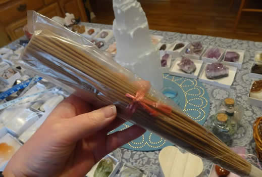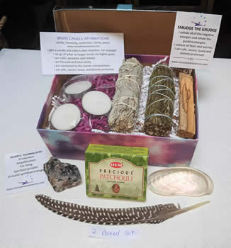 Includes: rosemary smudge stick 4 inch, white sage smudge stick 4 inch, palo santo smudge stick 4 inch, 8 inch feather, pearlized abalone seashell, Black Tourmaline in Quartz (Tourmalated Quartz, approx 2 inches, 3 ounces), Box of 10 patchouli incense cones, 3 tealight light candles, decorative box, property and affirmation cards.
